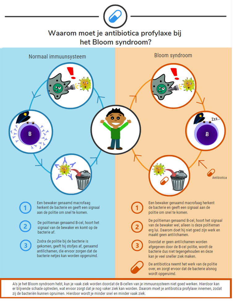 Het Bloom syndroom (BS) is een zeldzame erfelijke aandoening. Kinderen met dit syndroom zijn klein en mager en hebben last van huiduitslag als zij in de zon zijn geweest. Ook lopen ze een verhoogd risico op verschillende vormen van kanker. De afweerstoornis bij BS patiënten is mild.